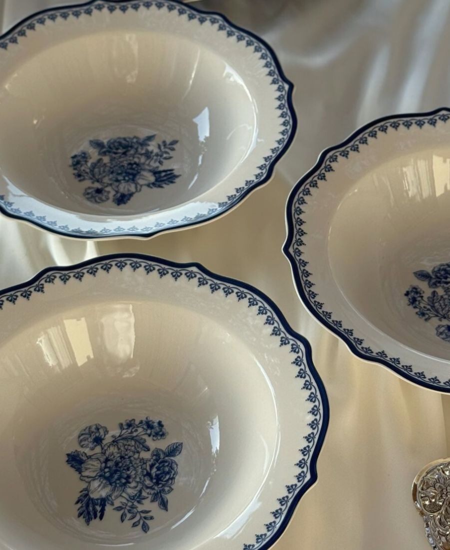 בלו רוז קולקשיין קערת סלט 18 ס”מ עשויה מפורצלן בצבע לבן עם גימור כחול בתוספת עיטורי פרחים על גבי הצלחת בצבע כחול.