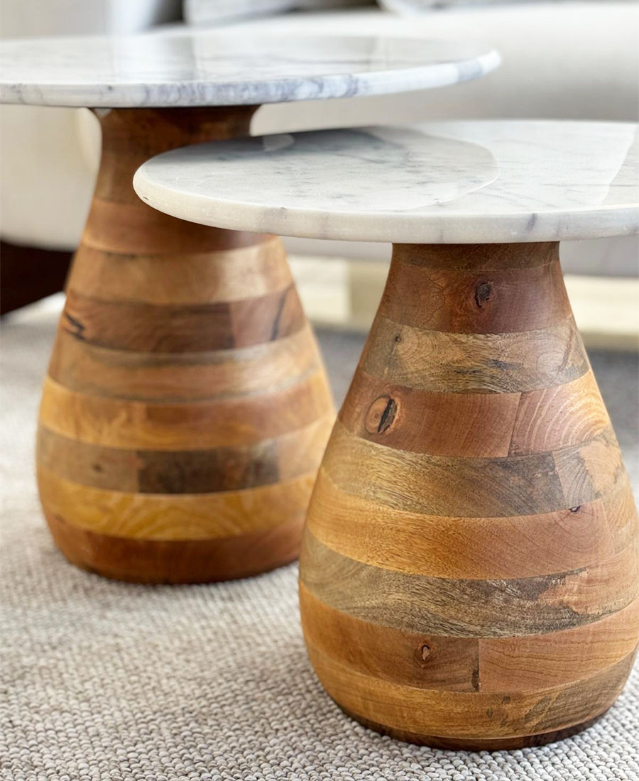 שולחן עשוי עץ מנגו רגל אמורפית בגוון טבעי.