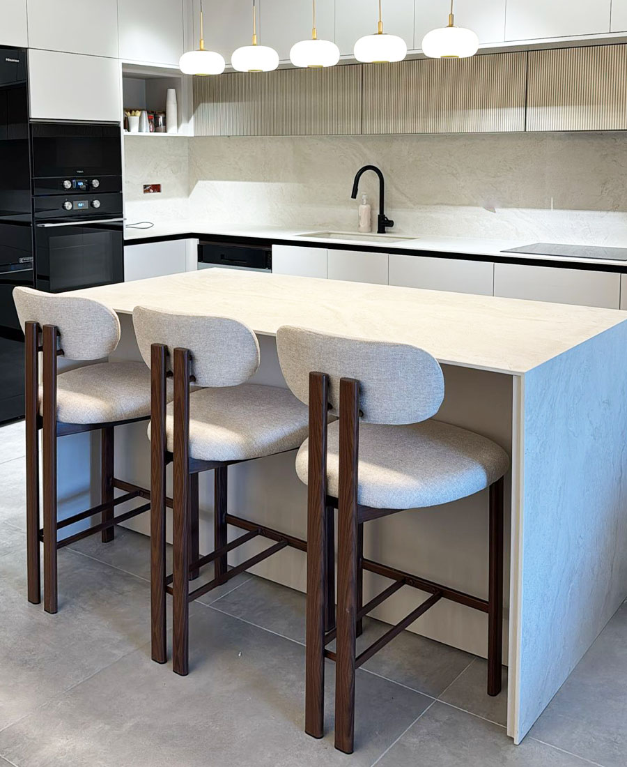 כסא בר דגם GISSELE עשוי בד ארוג בגוון אבן, רגל עשויה מתכת צבוע בגוון אגוז.