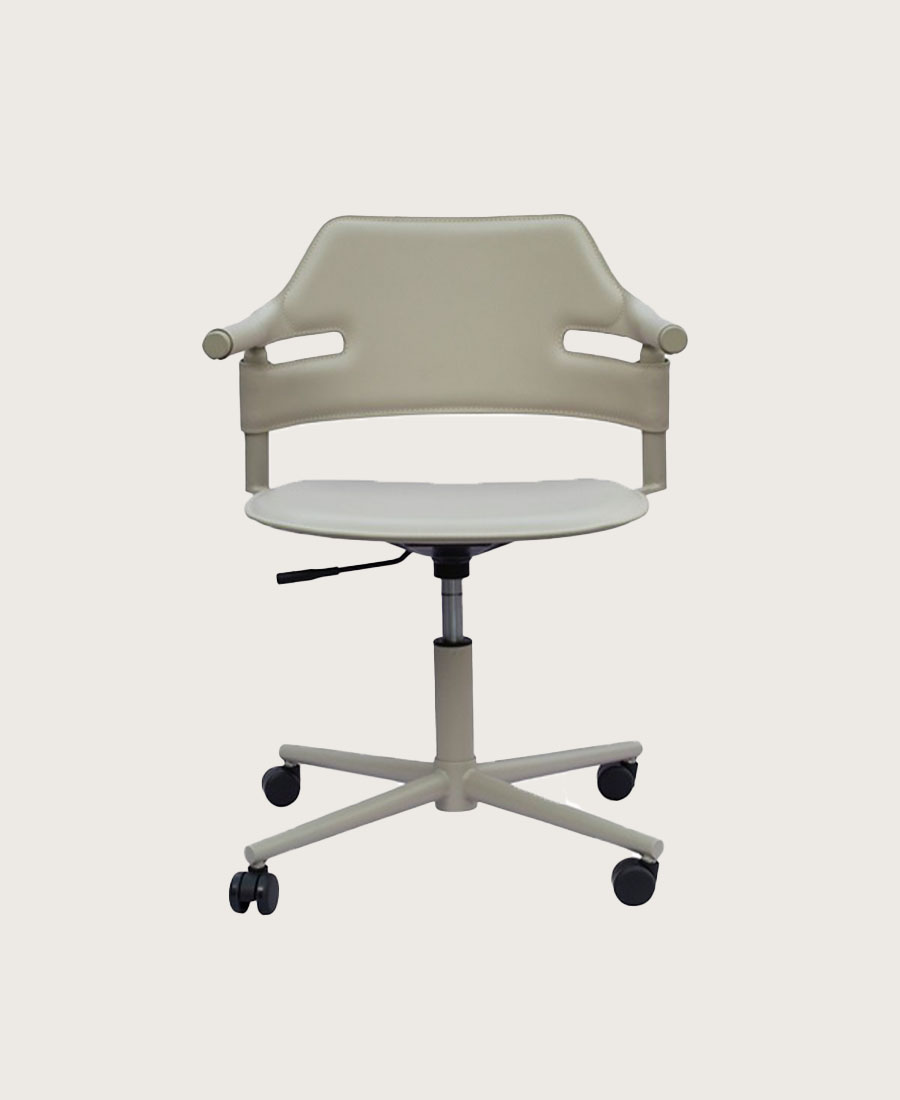 כסא משרד דגם אמנדה עשוי דמוי עור בגוון אבן עם רגל על גלגלים.