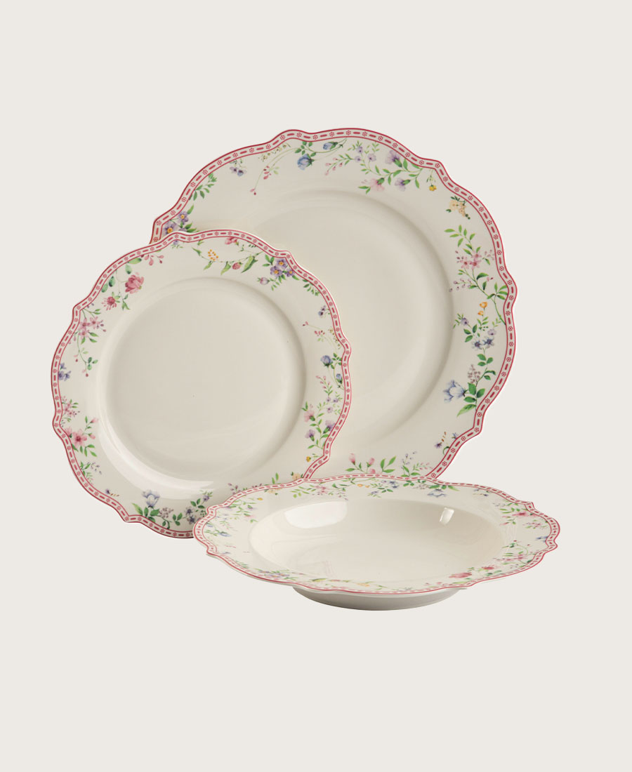 סט המתאים לשישה סועדים, מורכב מ18 חלקים : 6 צלחות מנה ראשונה 21 ס”מ, 6 צלחות מנה עיקרית 27 ס”מ, 6 צלחות עמוקות 22 ס”מ.