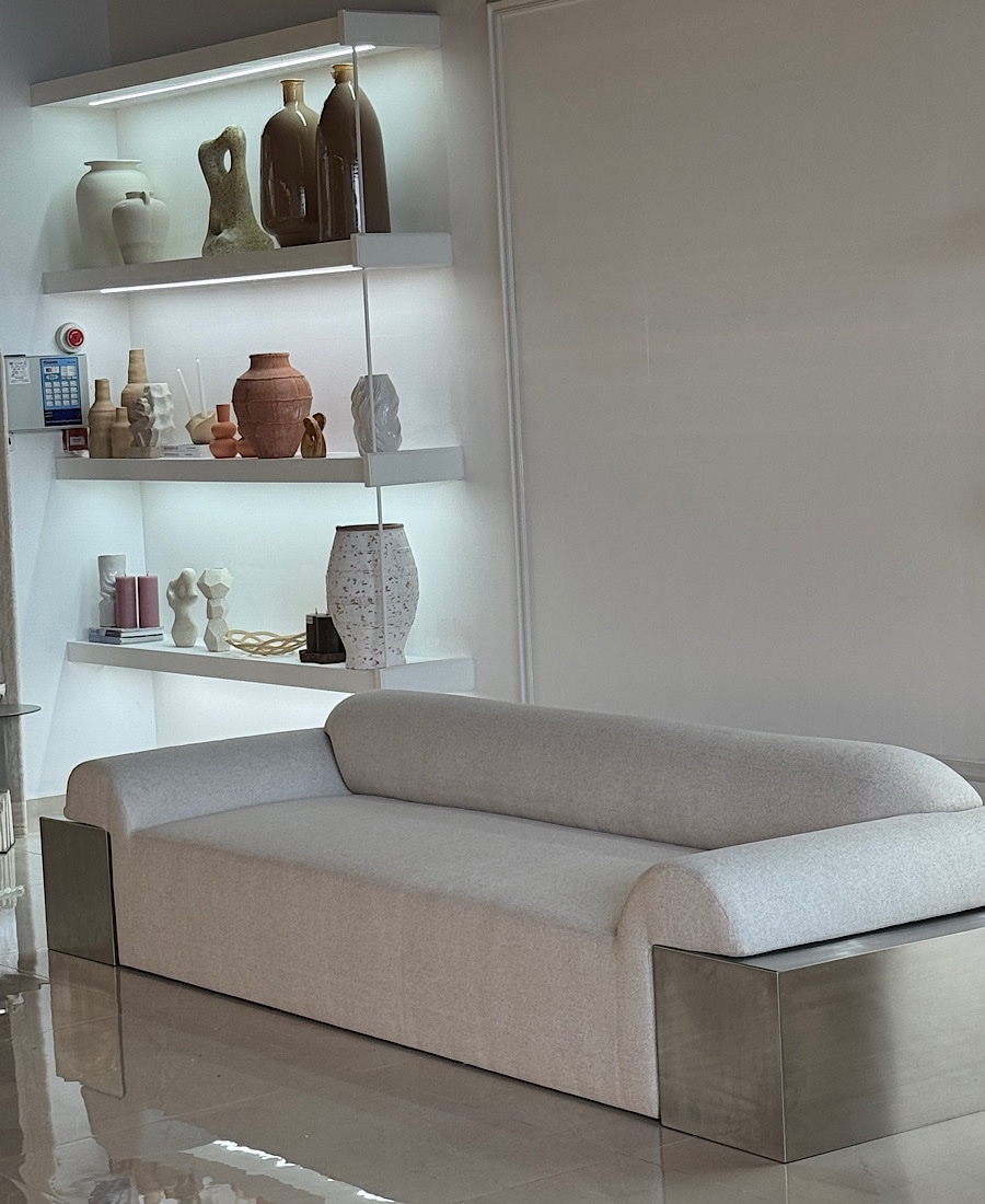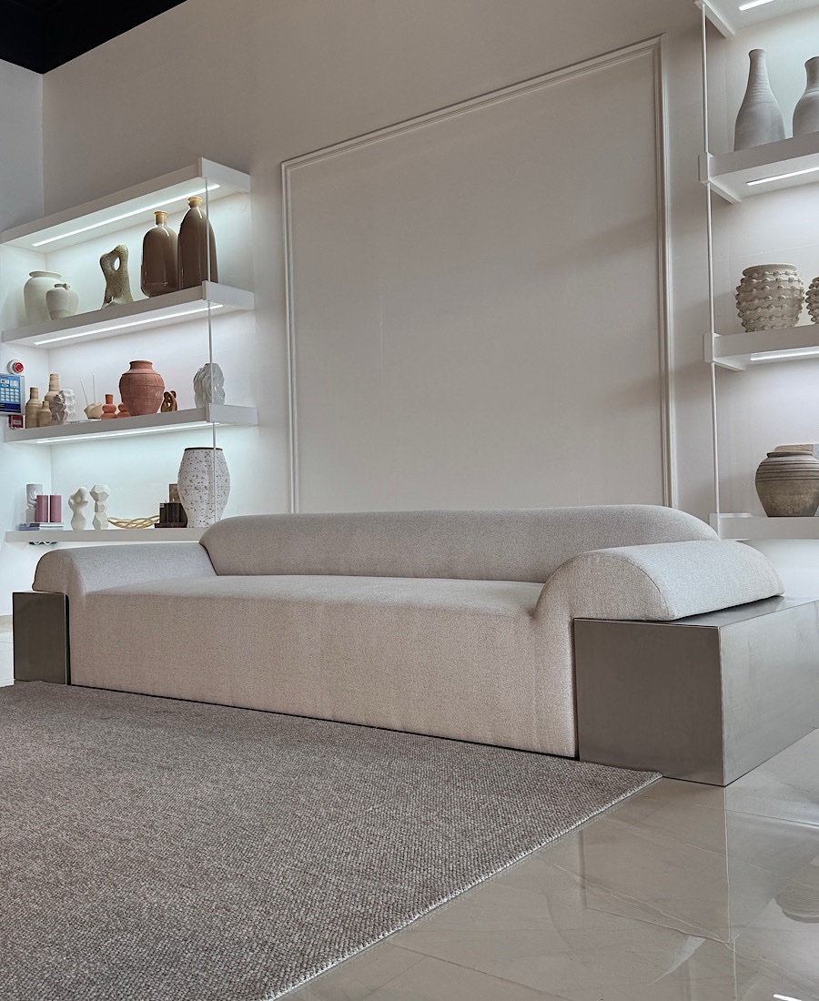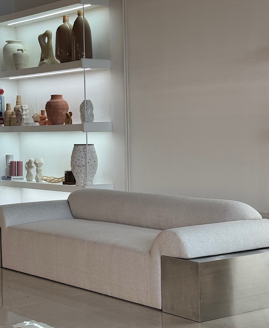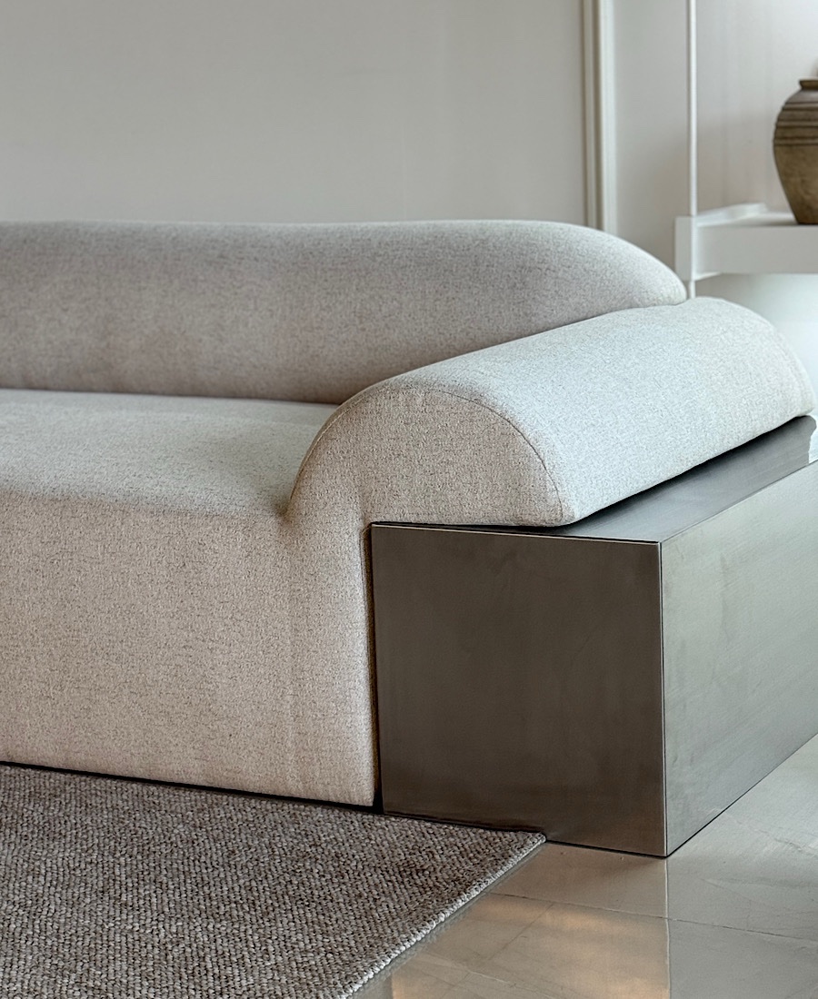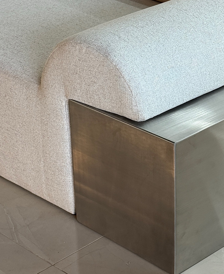ספה בייצור אישי עם ריבועי BOX מנירוסטה בצידי הספה