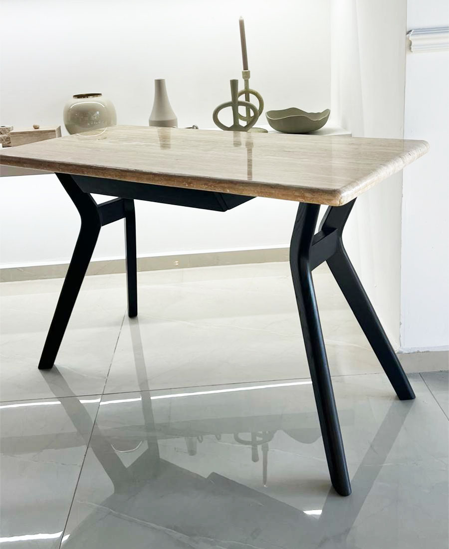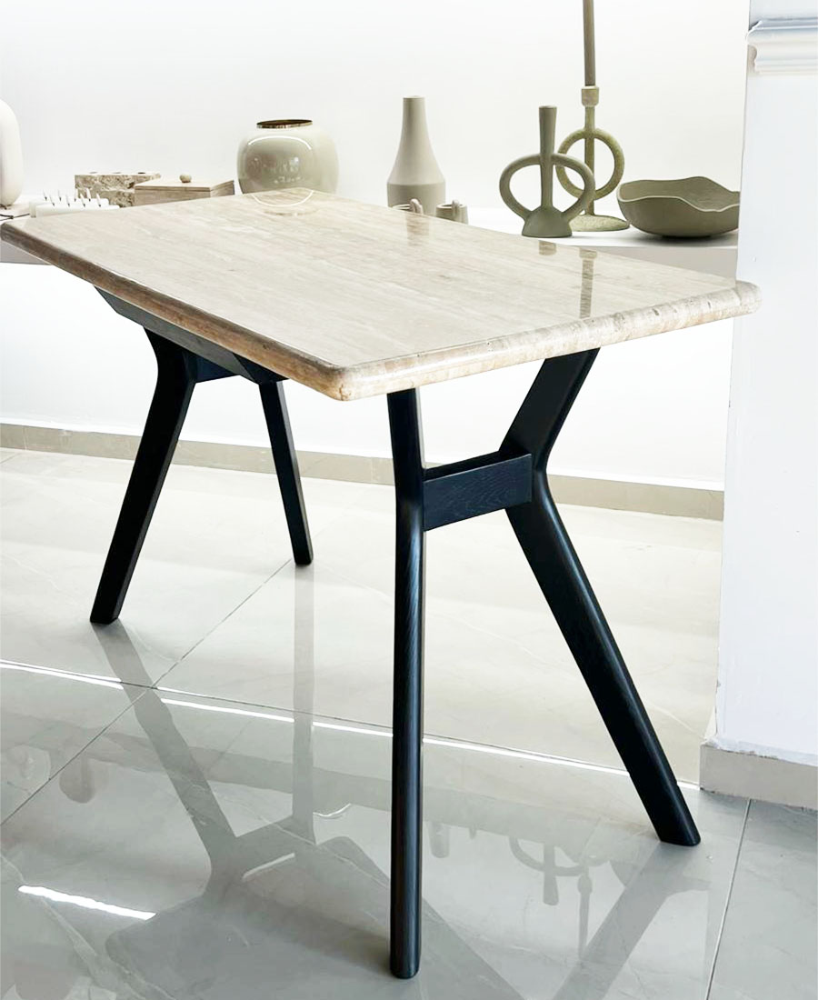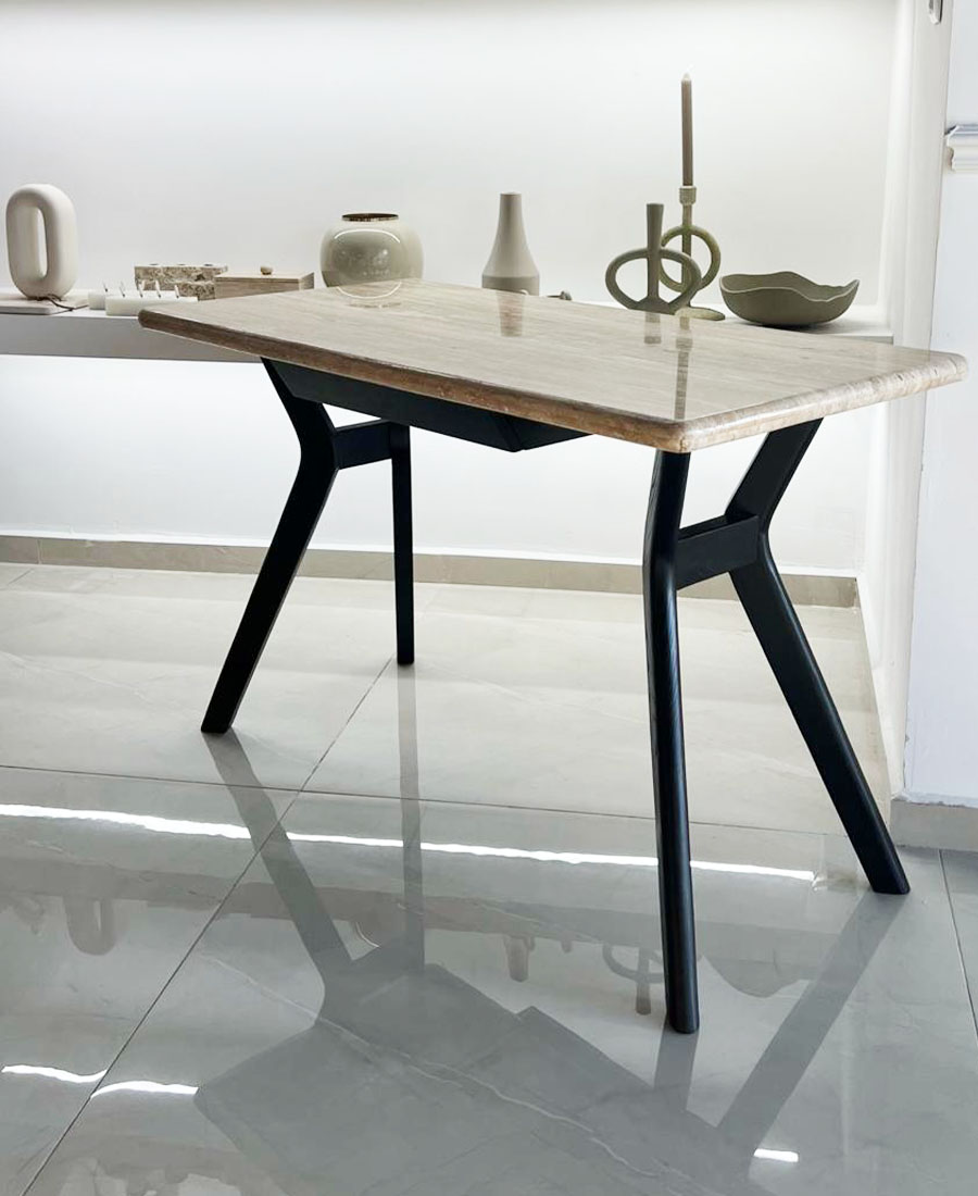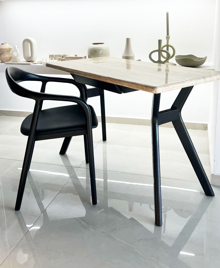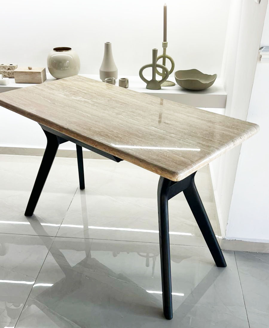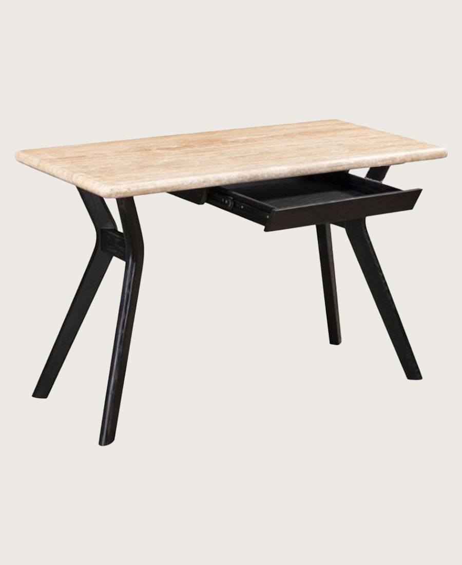 שולחן עבודה שיש מרקוני טרוונטין + מגירה. רגליים ומגירה עשויים עץ בצבע שחור.