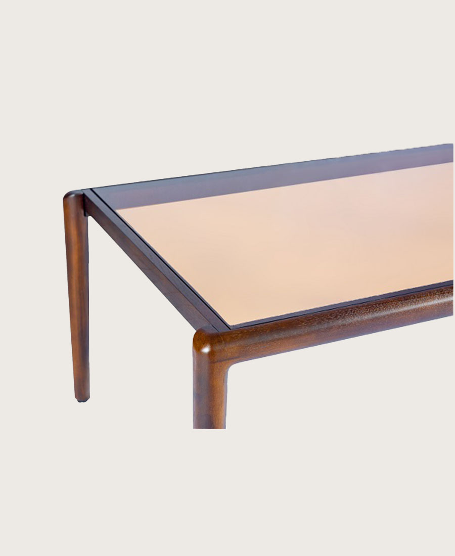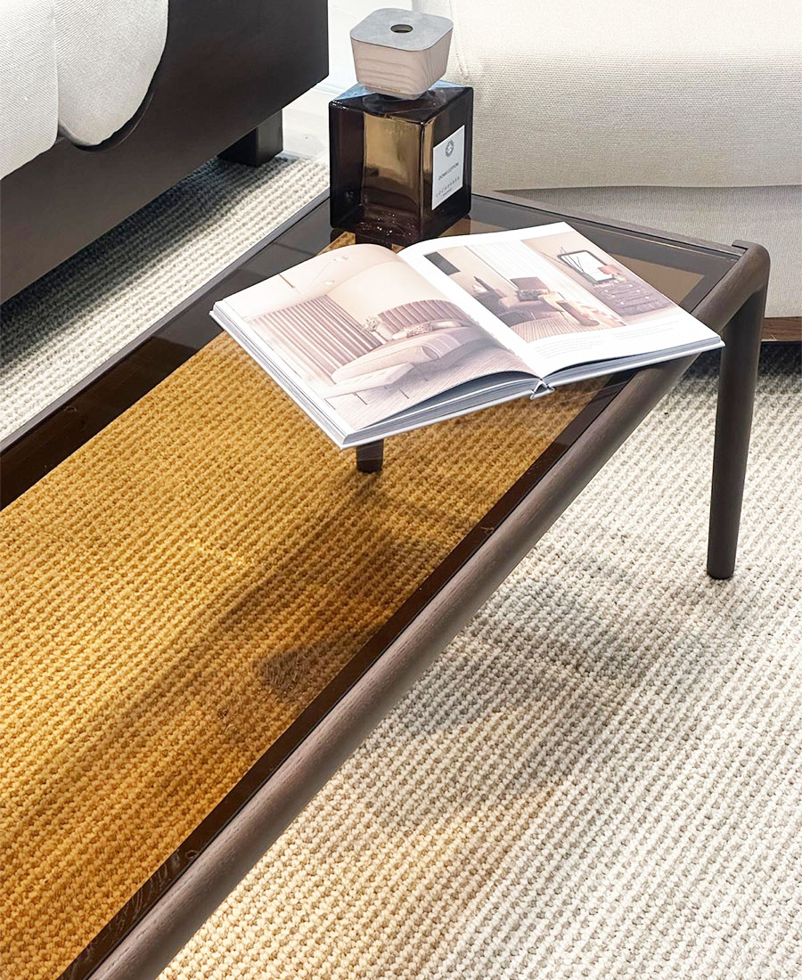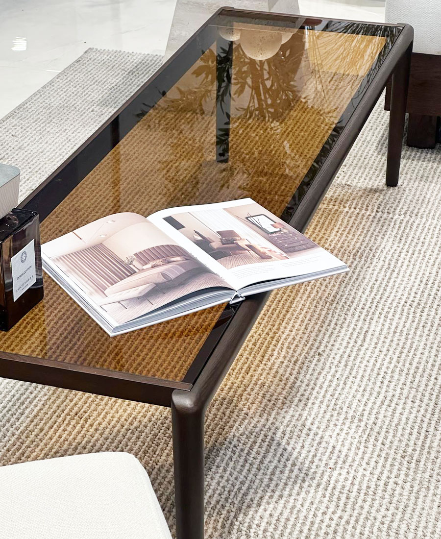 שולחן קפה מודרנה עם שילוב של עץ עשוי בגוון אגוז בצורה מלבנית וזכוכית בגגון חום.