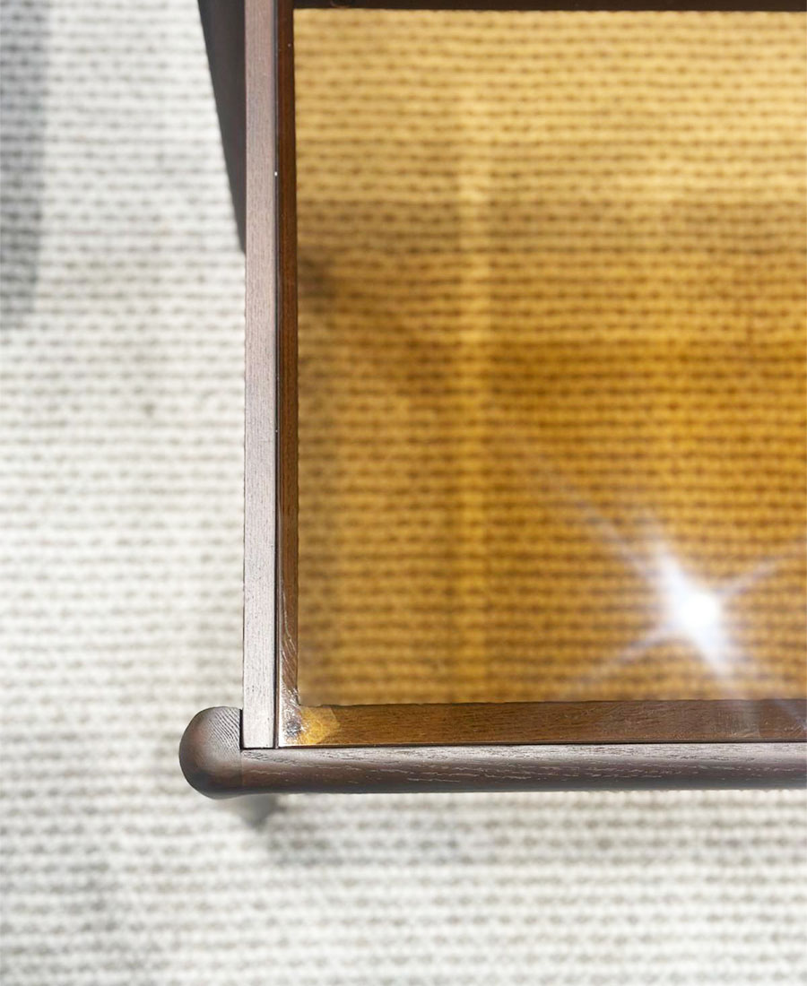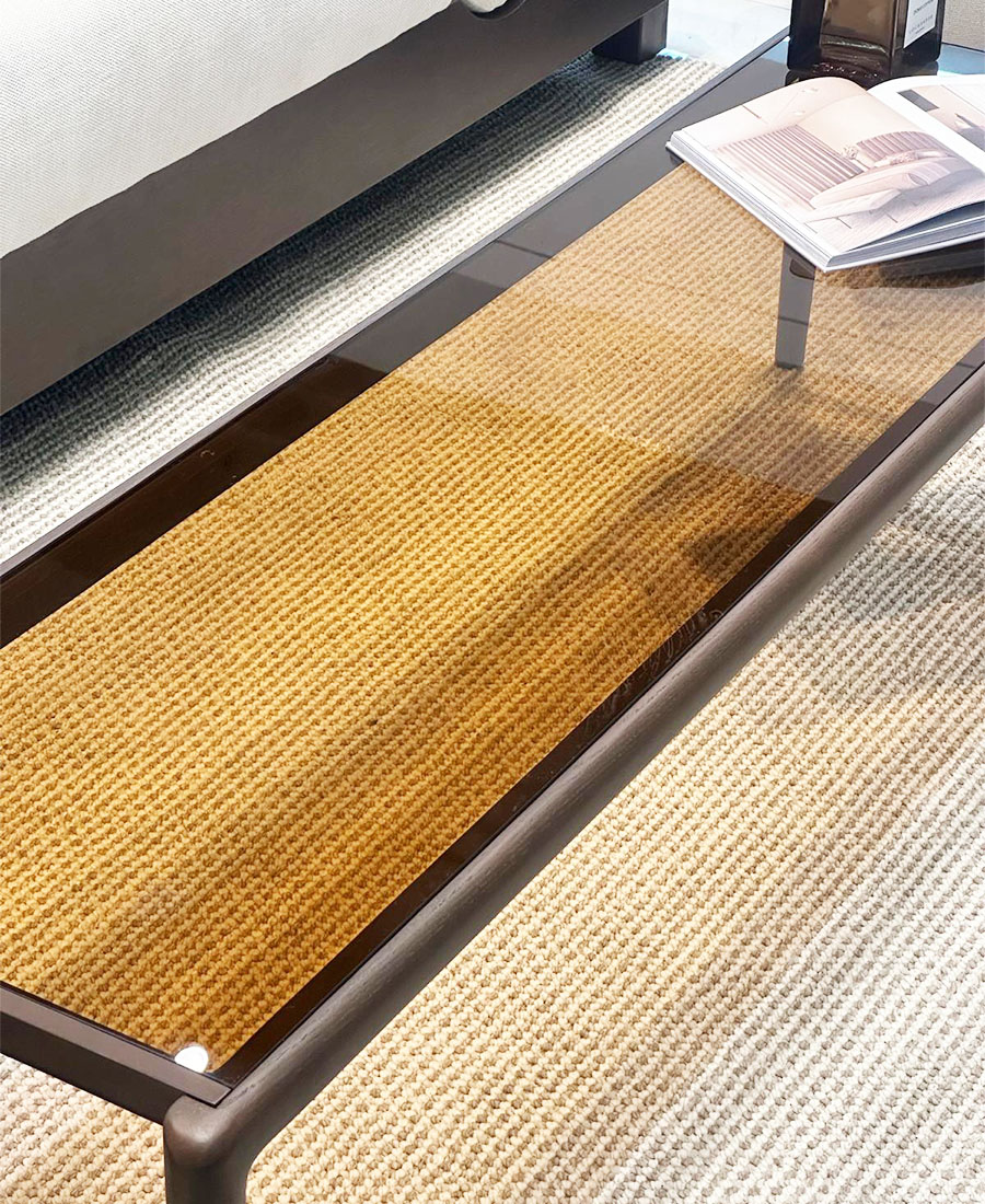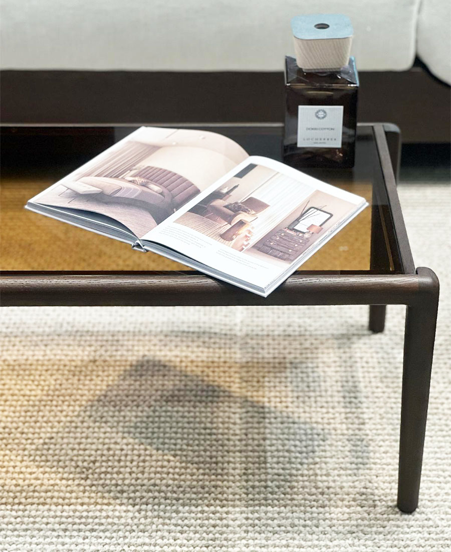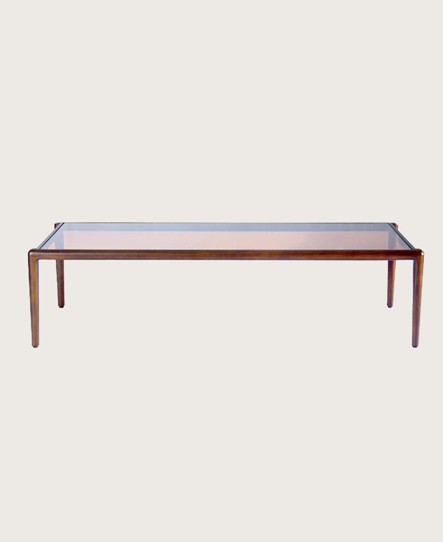 שולחן קפה מודרנה עם שילוב של עץ עשוי בגוון אגוז בצורה מלבנית וזכוכית בגגון חום.