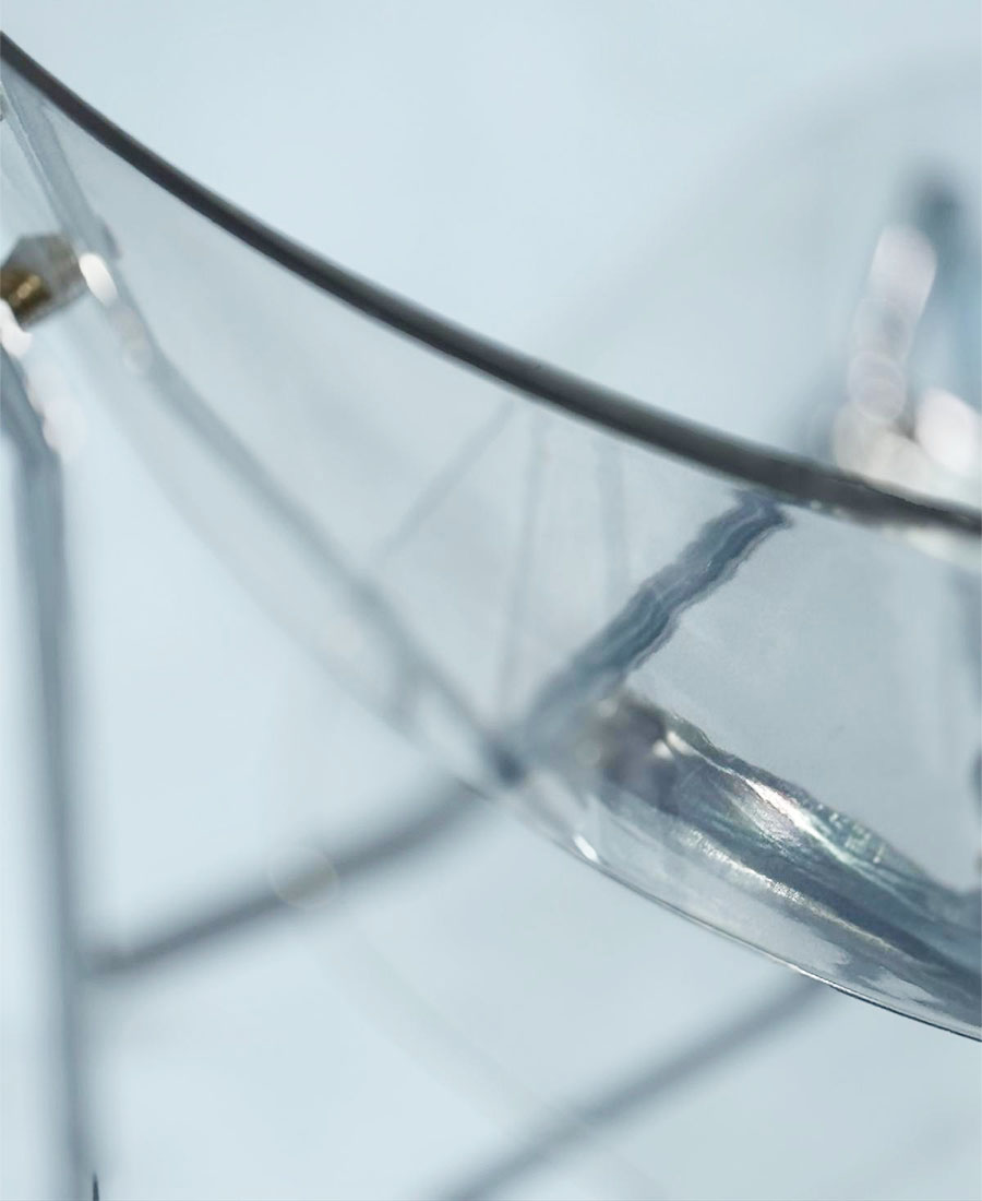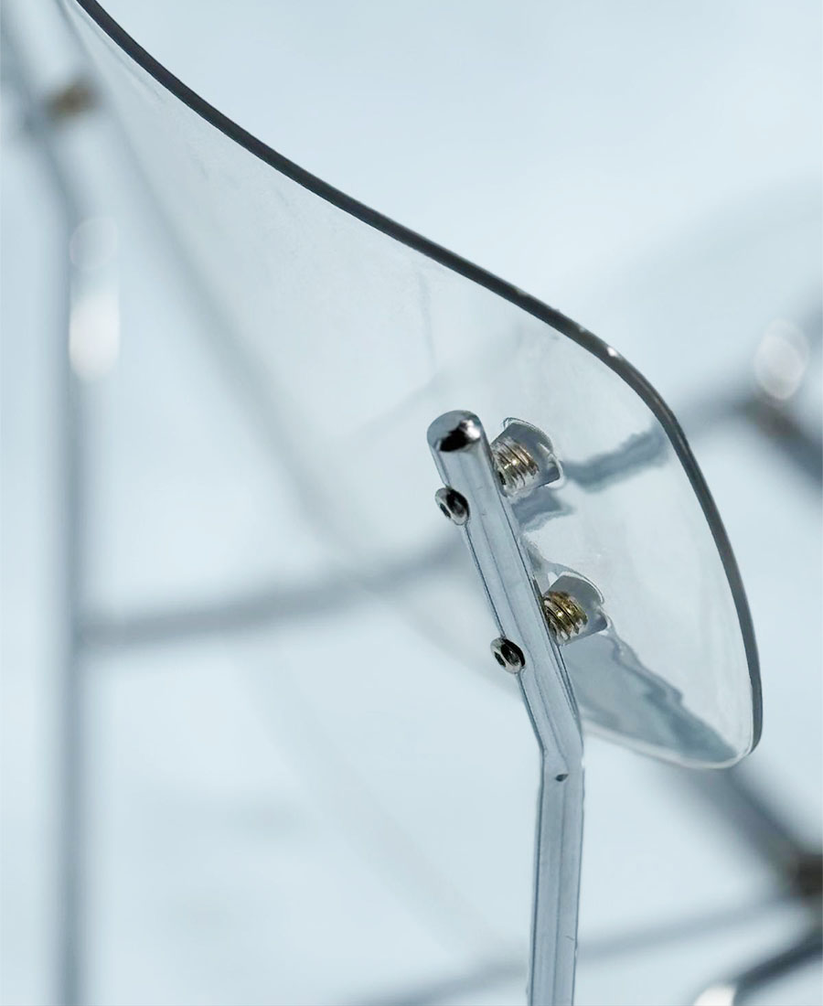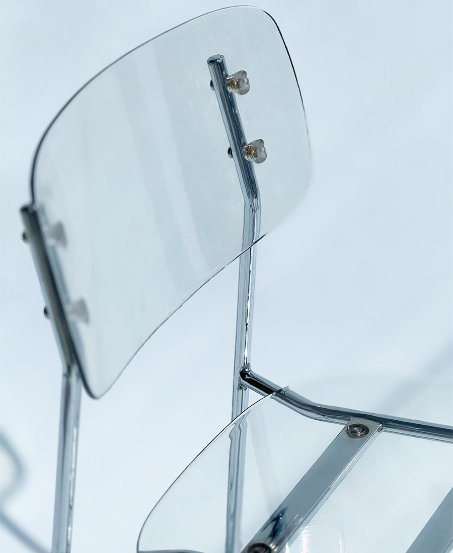 כסא פינת אוכל שקוף עשוי אקריליק איכותי עם רגליים עשויות מתכת בצבע כסף.