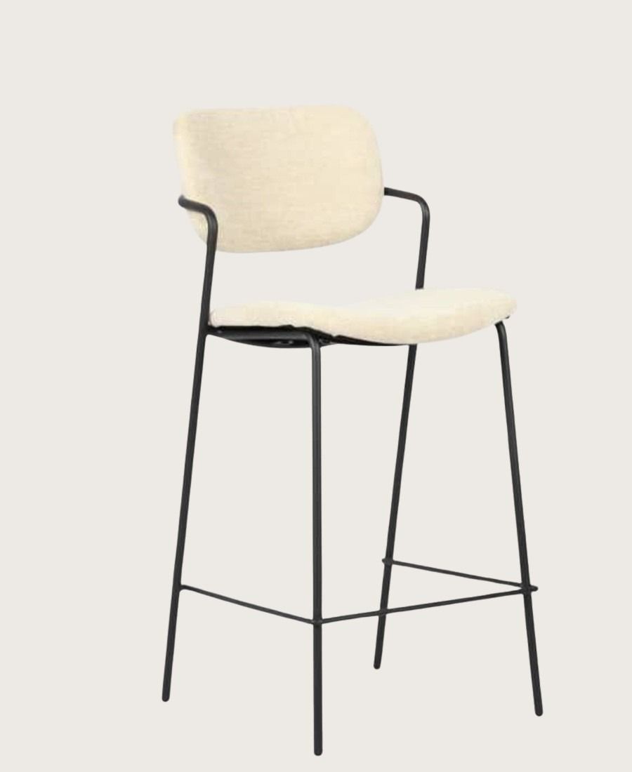 כסא בר, ריפוד הכיסא עשוי מבד בצבע שמנת, רגלי הכיסא עשויות ברזל בצבע שחור.