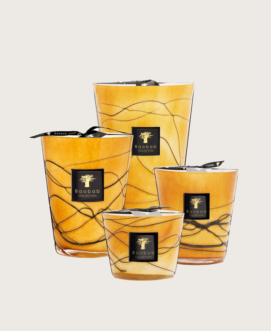 נר ריחני עשוי בזכוכית צהובה זהובה העטופה בחוטי זכוכית שחורים. הזכוכית עשויה בעבודת יד שהופך כל נר לפריט ייחודי וגם לפריט אספנים אמיתי..